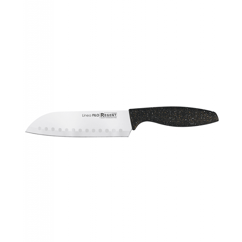 Нож сантоку Regent Linea Filo — профессиональный кухонный инструмент для точной нарезки овощей, фруктов, мяса и рыбы. Лезвие длиной 15 см из высококачественной нержавеющей стали обеспечивает остроту и долговечность, легко справляется с плотными продуктами. Эргономичная рукоять из прочного пластика гарантирует удобный и надежный хват даже при длительной работе. Общая длина ножа составляет 27,5 см при ширине 2 см, что делает его маневренным и сбалансированным. Стильный черный цвет и лаконичный дизайн делают нож практичным дополнением любой кухни. Вес всего 104 грамма снижает усталость руки. Произведен под контролем ООО «Регент Рус». Рекомендуется уточнять актуальные характеристики, цвет и наличие в конкретном магазине, так как внешний вид на изображении может отличаться из-за настроек экрана.