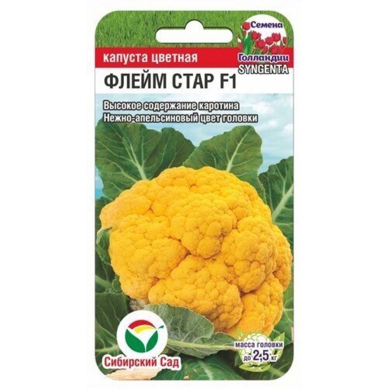 Цветная капуста Флейм Стар — среднеранний гибрид с уникальными оранжевыми соцветиями, созревающий за 75-80 дней. Головки массой до 2,5 кг отличаются плотностью, выровненной формой и нежным вкусом. Оранжевый цвет обусловлен повышенным содержанием бета-каротина и витамина А — их в 2,5 раза больше, чем в белых сортах, что делает капусту особенно полезной для здоровья глаз и иммунитета.