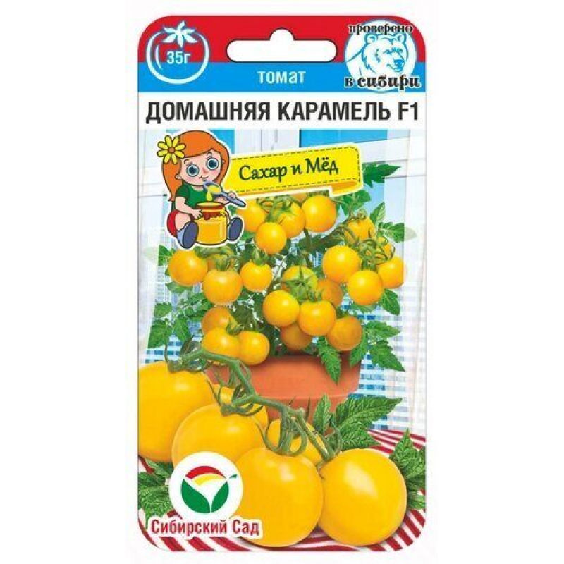 Томат Домашняя карамель F1 (15 семян от Сиб Сад) — раннеспелый гибрид черри для домашнего и садового выращивания. Созревает за 88-90 дней, подходит для подоконников, балконов, декоративных цветников. Карликовое растение высотой 20-25 см сочетает высокую урожайность (до 1,5 кг с куста) и эстетическую привлекательность: куст густо усыпан кистями из 30-35-граммовых плодов ярко-желтого цвета.