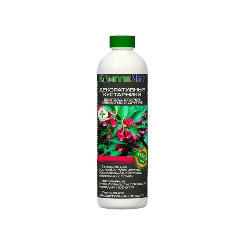 КОМПЛЕМЕТ Декоративные кустарники - это жидкое комплексное удобрение со сбалансированным соотношением элементов питания, оказывающих стимулирующее воздействие на ростовые процессы и закладку цветочных почек декоративных кустарников. Предназначено для подкормок рододендрона кетевбинского, вейгелы гибридной и других вечнозелёных и листопадных кустарников. Удобрение КомплеМет для декоративных кустарников совместимо с большинством средств, используемых для защиты растений. Перед применением необходимо провести предварительную проверку на химическую совместимость. Рекомендации по применению: Некорневая подкормка – опрыскивание поверхности растений раствором удобрения в концентрации 10 мл на 1 л воды. Корневая подкормка – полив растений под корень раствором удобрения в концентрации: 50 мл на 1 л воды при выращивании в открытом грунте; 30 мл на 1 л воды при выращивании в горшках и кашпо. Подкормки проводить с интервалом 14 дней в течение активной вегетации. Возможно совместное применение со средствами защиты растений. Не проводить некорневую подкормку в домашних условиях под прямыми солнечными лучами, во избежание ожогов листьев, а в открытом грунте – при температуре воздуха> 25 оС, сильном ветре, ожидающихся осадках (не менее 4 часов до дождя).