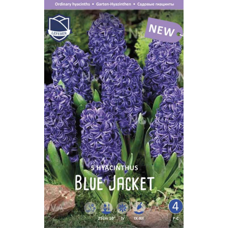 Гиацинты Blue Jacket - один из новых сортов гиацинтов с ароматными соцветиями, состоящими из многочисленных колокольчатых цветков лилово-синего цвета с более светлым краем, что создает иллюзию полосатого цветка. Высота растения составляет около 25 см. Цветение начинается, в зависимости от климатических условий, в апреле и продолжается, в среднем, около двух недель.