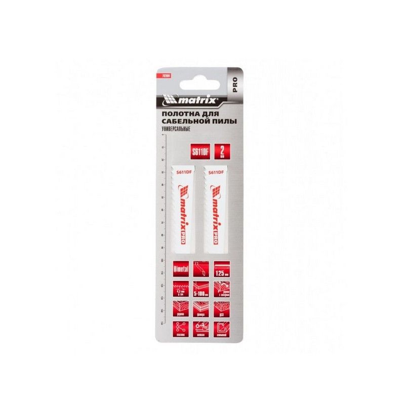 Универсальные полотна для сабельной пилы Matrix PRO 782004, S611DF, 125/4,3 мм, Bimetal, 2 шт. в упаковке, позволяют распиливать заготовки из дерева, пластика, листового металла, фанеры, ДСП, справляются также с алюминиевыми профилями и древесиной с гвоздями. В зависимости от материала глубина распила составляет от 5 до 100 мм. Полотна пригодятся на строительной площадке, во время ремонта, демонтажа различных конструкций, будут полезны дома и на даче. Преимущества: Пилки выполнены из биметалла (основа — пружинная сталь, рабочая кромка — быстрорежущая сталь), поэтому отличаются высокой режущей способностью в сочетании с прочностью и упругостью. Твердость режущей кромки составляет 60-64 HRC, поэтому она сохраняет свои рабочие качества при длительном использовании. Зубья с шагом 4,3 мм обеспечивают быстрый и качественный распил любых материалов. В упаковке 2 полотна, которых хватит для выполнения большого объема работ.