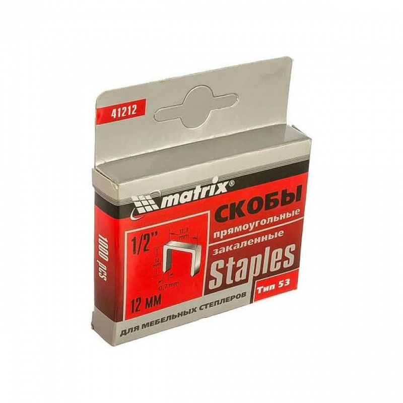 Скобы MATRIX 41212 изготовлены из углеродистой стали. Закалены. Тип 53. Ширина скобы – 11.3 мм., толщина – 0.7 мм. Используются в комплекте со степлером для крепления тканей, листовых материалов из дерева, ДСП и т.п. Подходят для степлеров MATRIX моделей 40902, 40903.