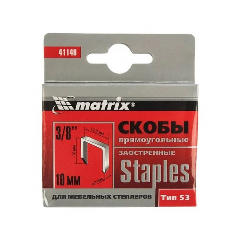 Скобы MATRIX 41140 используются для соединения изделий из дерева, фанеры, картона, ДСП, оргалита, для обшивки мебели тканями посредством специальных скобозабивных пистолетов (степлеров). Наконечники скоб данной серии заостренные. Тип 53. Ширина скобы – 11.3 мм., толщина – 1 мм. Подходит для степлеров MATRIX моделей 40902, 40903, 40907, 40909.