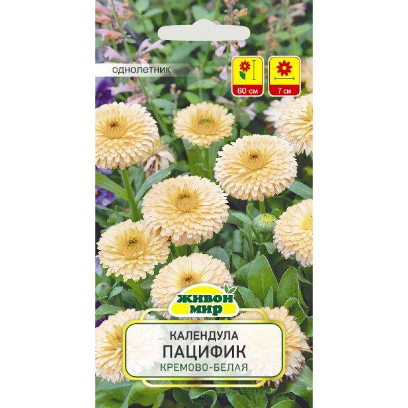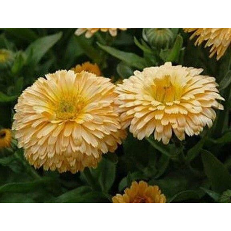 Красивая календула с крупными махровыми кремово-белыми соцветиями до 7 см в диаметре.