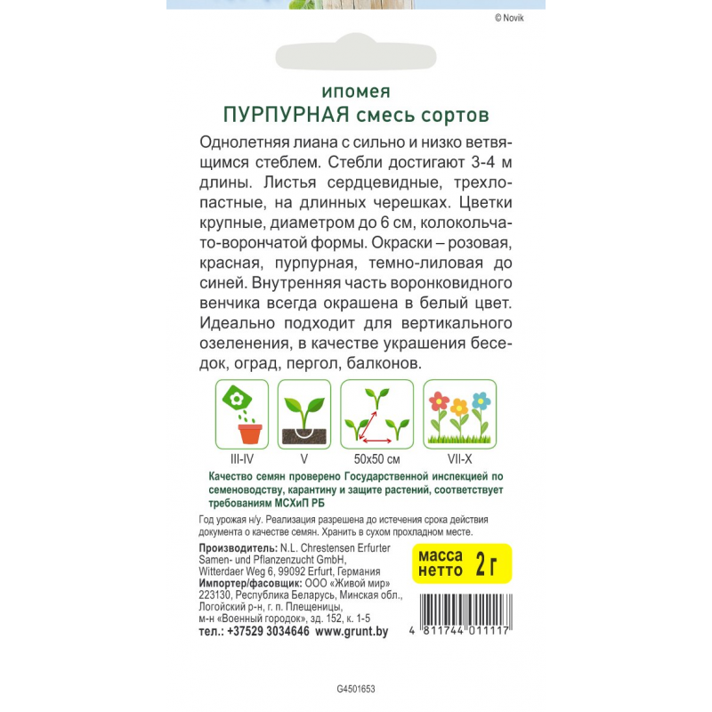 Высота 300 см Однолетняя лиана с сильно и низко ветвящимся стеблем. Стебли достигают 3-4 м длины. Листья сердцевидные, трехлопастные, на длинных черешках. Цветки крупные, диаметром до 6 см, колокольчато-ворончатой формы. Окраски — розовая, красная, пурпурная, темно-лиловая до синей. Внутренняя часть воронковидного венчика всегда окрашена в белый цвет. Идеально подходит для вертикального озеленения, в качестве украшения беседок, оград, пергол, балконов.