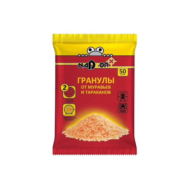 Средство Гранулы от муравьев и тараканов (50г) Nadzor GRAN123 - высокоэффективные гранулы для уничтожения муравьев и тараканов. Они отлично себя зарекомендовали в борьбе с ползающими насекомыми, как в помещениях, так и на открытом пространстве. Гранулы представляют собой сыпучее вещество красного цвета. В состав гранул входит пищевой аттрактант, который привлекает к приманке муравьев. 100% защита дома от домовых и садовых муравьев. Срок действия — до 2 месяцев.