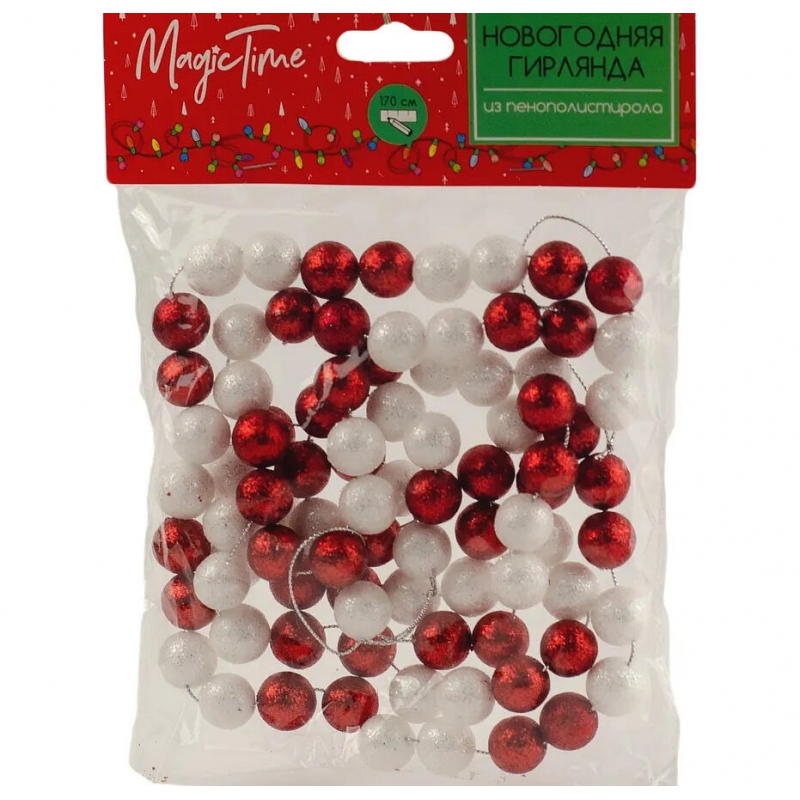 Новогодние бусы MAGIC TIME длиной 170 см и шириной 1,5 см станут ярким украшением вашей елки. Изготовленные из качественного пластика в классическом красно-белом цвете, они создают праздничную атмосферу и добавляют уюта в интерьер. Легкие (всего 15 грамм) и прочные, эти бусы легко размещаются на ветвях елки, равномерно распределяясь по всему дереву. Универсальное украшение подойдет для оформления как домашней елки, так и офисного помещения. Сочетание традиционных красного и белого цветов символизирует новогоднее настроение и зимнюю сказку. Бусы упакованы в индивидуальную упаковку, что обеспечивает удобное хранение после праздников.