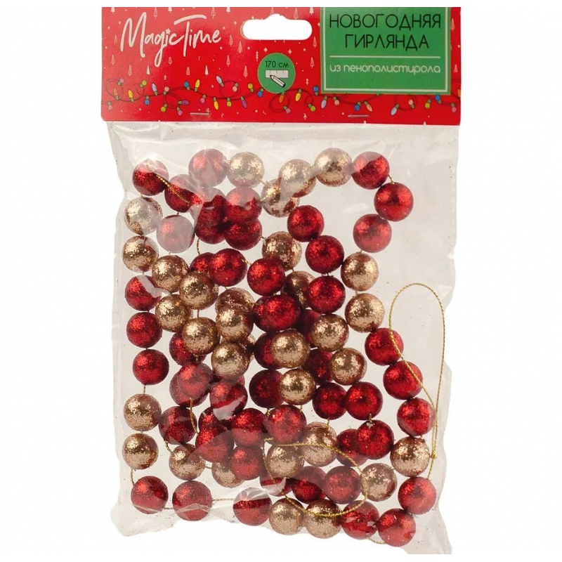 Элегантные елочные бусы MAGIC TIME длиной 170 см создадут праздничное настроение в вашем доме. Изделие выполнено из качественного пластика в стильном сочетании красного и золотого цветов, что придает декору роскошный и торжественный вид. Бусы шириной 1,5 см идеально подходят для украшения новогодней ели, создания гирлянд и декорирования интерьера. Легкий вес (всего 15 грамм) позволяет размещать украшение даже на самых хрупких ветках. Яркие цвета и прочный материал обеспечивают долговечность использования - эти бусы будут радовать вас многие праздничные сезоны. Универсальное украшение подойдет для дома, офиса или праздничного мероприятия.