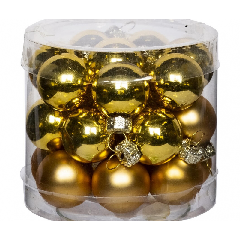 Набор из 24 елочных шаров MAGIC TIME диаметром 2,5 см в роскошном золотом исполнении. Эти изящные стеклянные украшения создадут праздничную атмосферу в вашем доме. Идеально подходят для декорирования новогодней ели, создания тематических композиций и праздничного оформления интерьера. Шары выполнены из качественного стекла с равномерным золотым покрытием, что обеспечивает их привлекательный внешний вид и долговечность. Компактный размер позволяет использовать их для украшения как больших елей, так и небольших настольных деревьев. Набор упакован в удобную коробку для хранения, что гарантирует сохранность украшений между сезонами.