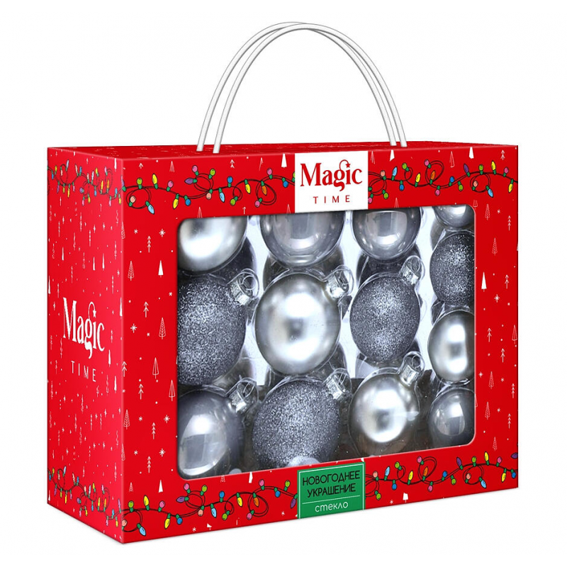 Качественное стекло; Серебряное покрытие; Разный размер шаров (5-7 см); Полный набор для украшения елки; Удобная упаковка для хранения