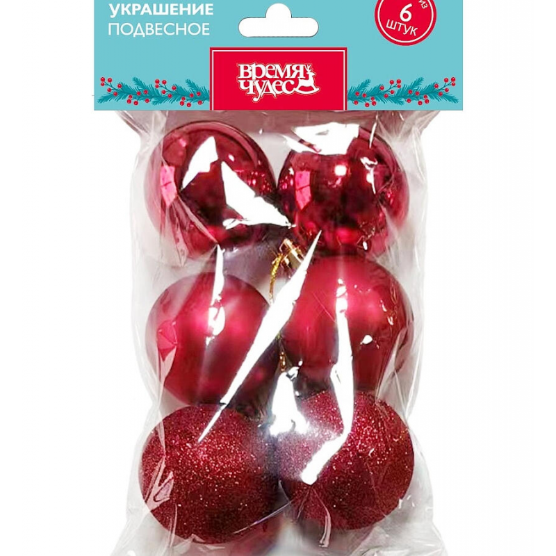Яркий красный цвет создает праздничное настроение; Прочный пластик обеспечивает долговечность; Компактный размер 5 см подходит для любой елки; Набор из 6 шаров для гармоничного декора; Легкие и безопасные для использования
