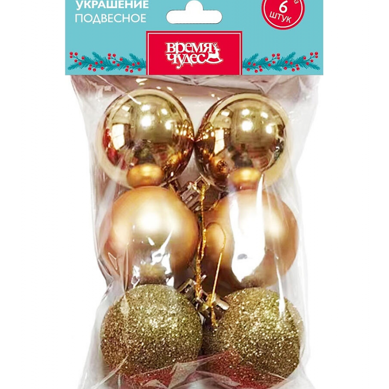 Прочные пластиковые шары; Элегантный золотой цвет; Удобная упаковка для хранения; Компактный размер 5 см; Набор из 6 штук; Долговечное использование