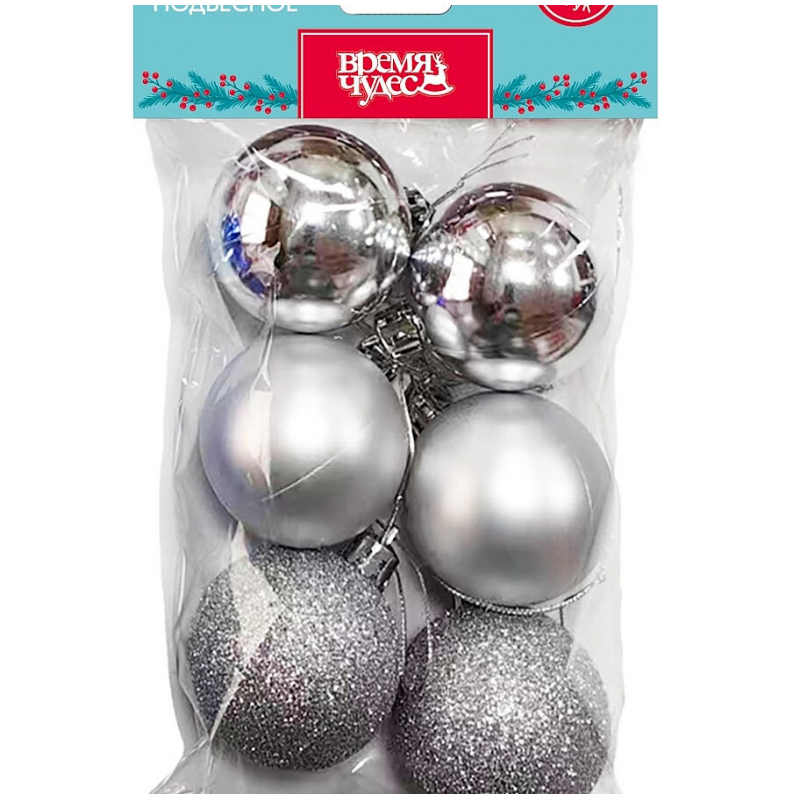 Набор из 6 елочных шаров MAGIC TIME диаметром 5 см в элегантном серебряном исполнении. Шары изготовлены из качественного пластика, что обеспечивает их прочность и долговечность. Серебряный цвет создает праздничное настроение и гармонично сочетается с любыми другими украшениями. Компактный размер шаров позволяет использовать их для декорирования как больших, так и небольших елок. Набор упакован в удобную упаковку для хранения. Идеальное решение для создания новогодней атмосферы в доме, офисе или любом другом помещении. Легкие и безопасные шары подходят для украшения елок любой конфигурации.