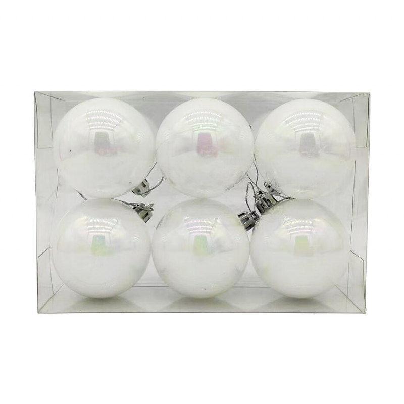 Прочные пластиковые шары; Классический белый цвет; Легкий вес; Компактный набор из 6 штук; Универсальное украшение для елки