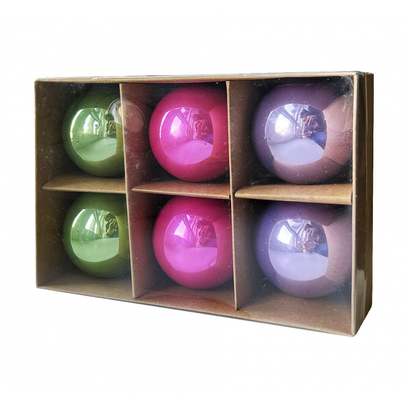Качественное стекло; Яркие разноцветные украшения; Удобная упаковка для хранения; Классический дизайн; Универсальность использования; Комплект из 6 шаров