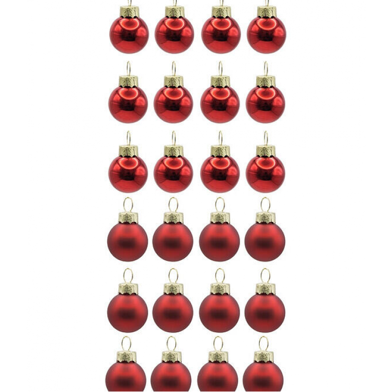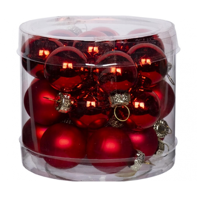 Яркий красный цвет создает праздничную атмосферу; Качественное стекло обеспечивает долговечность; Классический дизайн подходит для любого интерьера; Компактный размер удобен для размещения на елке; Полный набор из 24 шаров для гармоничного декора
