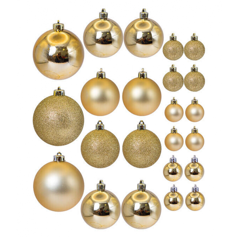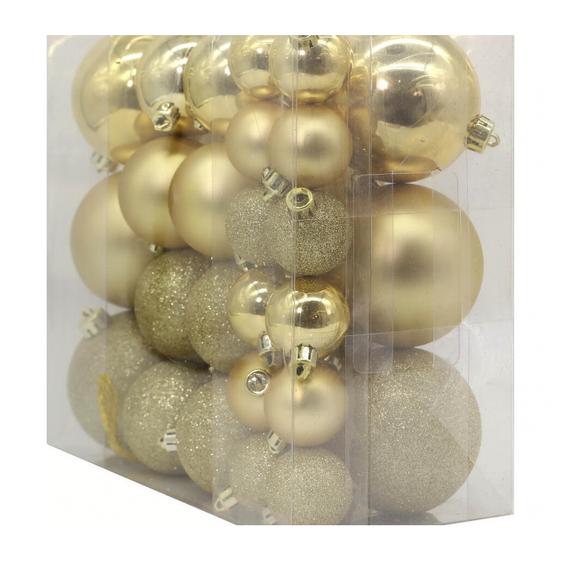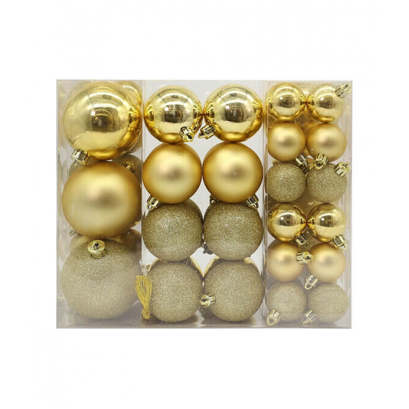 Набор из 46 шаров разных размеров; Качественный пластик; Элегантный золотой цвет; Прочная конструкция; Удобная упаковка для хранения
