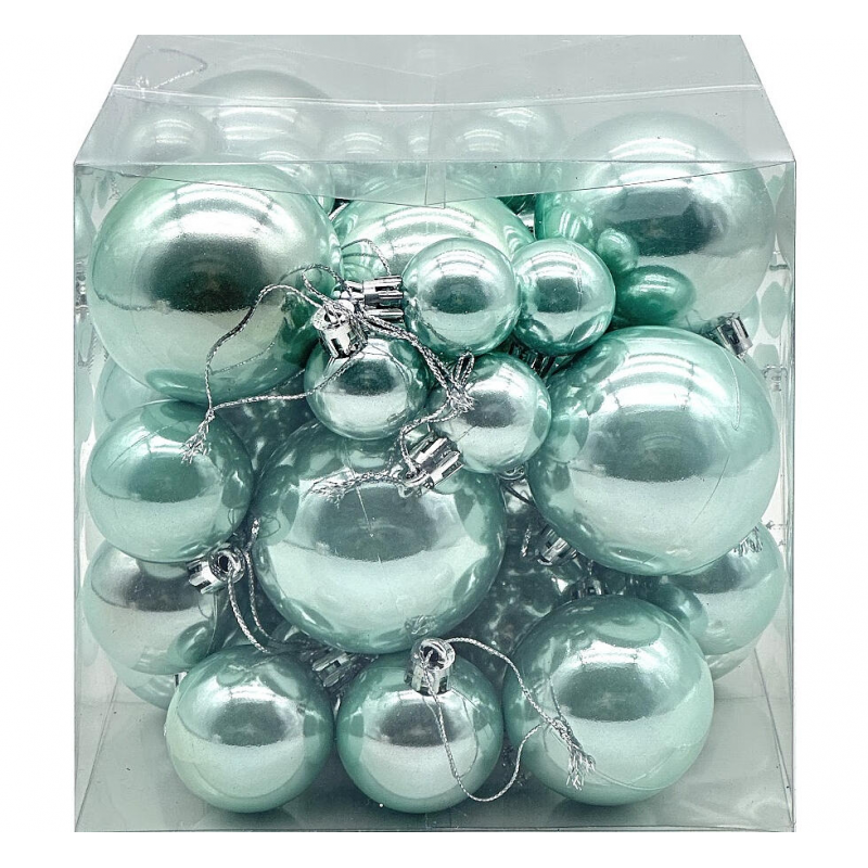 59 шаров в наборе; прочный пластик; разнообразие размеров 3-6 см; гармоничная зеленая гамма; устойчивость к повреждениям; многоразовое использование; удобное хранение