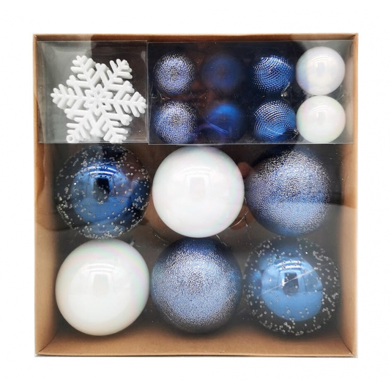 Прочные небьющиеся шары; Элегантная бело-синяя гамма; Разнообразие размеров для декора; Комплект из 30 украшений; Удобное хранение; Подходят для семей с детьми
