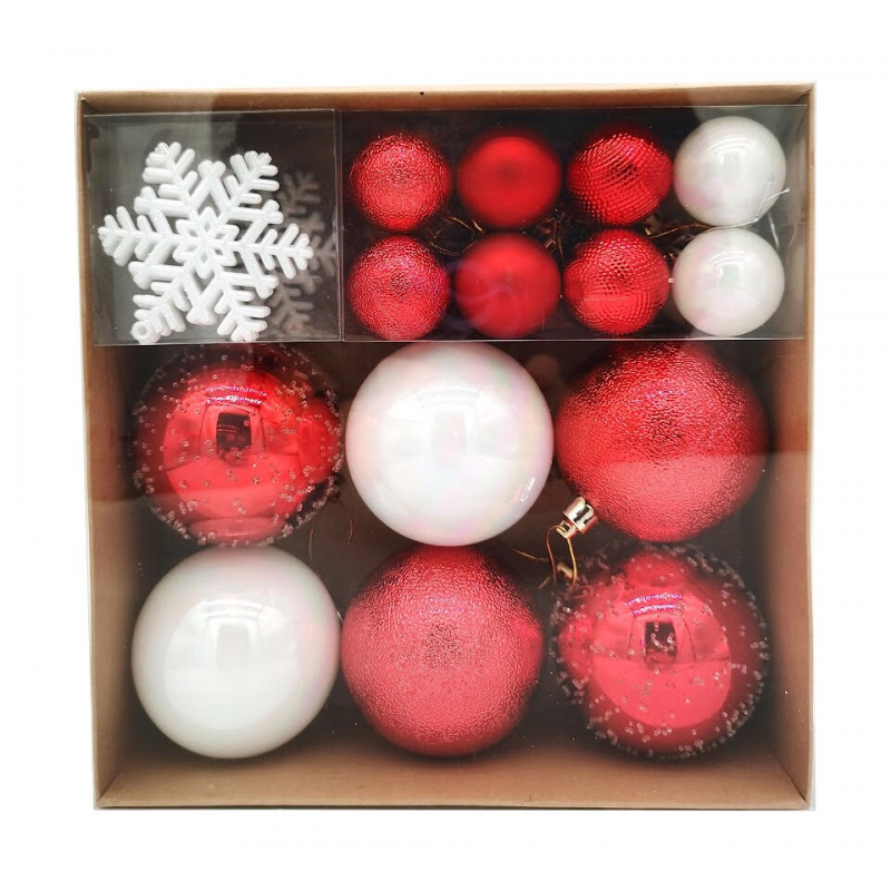 Классическое бело-красное сочетание; Три разных размера для гармоничной композиции; Прочный пластик для долговечности; Полный набор из 30 украшений; Легкий вес и удобное хранение