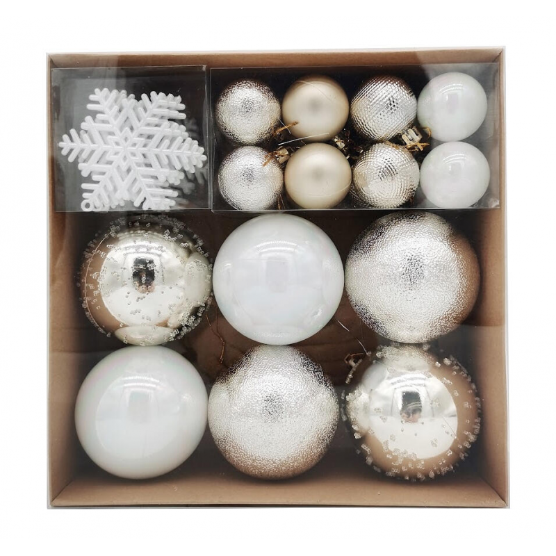 30 украшений в наборе; три размера для гармоничной композиции; качественный белый пластик; легкий вес; прочность и долговечность; готовое решение для новогоднего декора