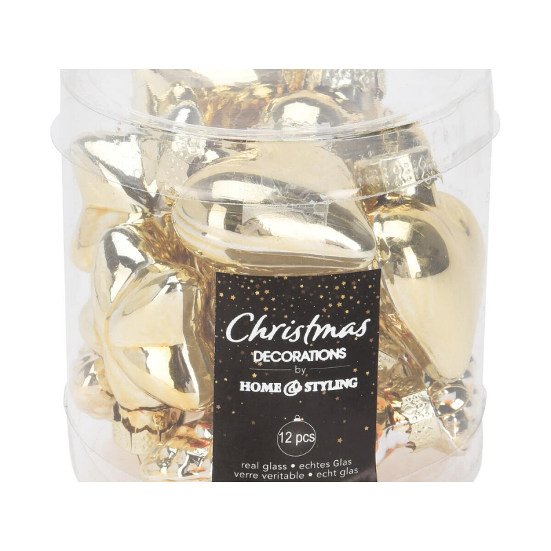 Качественное стекло с золотым покрытием; Компактный размер 4 см для универсального использования; Набор из 9 одинаковых украшений для гармоничного декора; Элегантный золотой цвет создает праздничную атмосферу; Подвесная конструкция для удобного размещения на елке