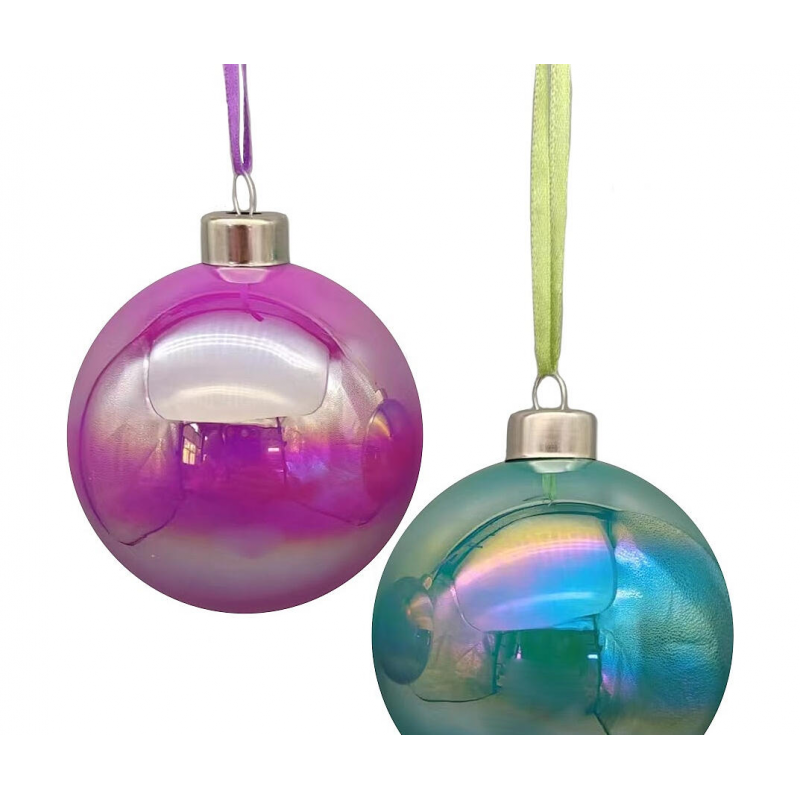 Яркое сочетание зеленого и розового цветов; Качественное стекло для долговечности; Легкий вес для удобного размещения; Универсальный диаметр 8 см подходит для любой елки; Создает праздничную атмосферу