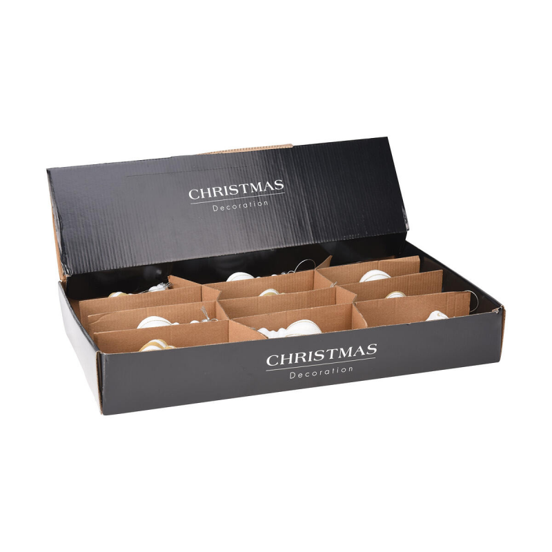 Это елочное украшение предназначено для создания праздничной атмосферы в вашем доме. Аккуратно повесьте его на ветви новогодней елки, равномерно распределяя с другими украшениями для создания гармоничной композиции. Белый цвет прекрасно сочетается с традиционными красными, золотыми и серебряными украшениями. Рекомендуется размещать украшение на хорошо видных местах, чтобы подчеркнуть его элегантность. При хранении оберните украшение мягкой бумагой или тканью для защиты от повреждений. Избегайте падений и резких ударов, так как изделие выполнено из стекла. Украшение можно использовать как самостоятельный элемент декора или в комплекте с другими украшениями из коллекции KOOPMAN.