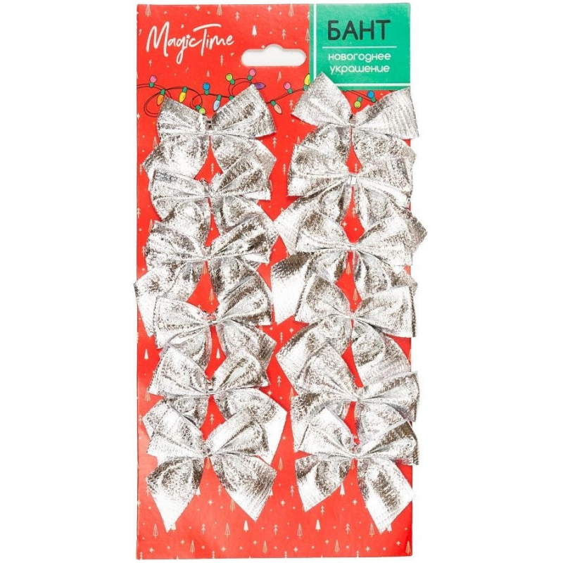Набор из 12 елочных украшений в виде изящных бантов от бренда MAGIC TIME. Украшения выполнены из качественного полиэстера серебристого цвета, что придает им праздничный блеск и элегантность. Каждый бант имеет размер 5 см, что делает их идеальным декором для новогодней елки, создания гирлянд или украшения интерьера. Компактный набор поставляется в удобной упаковке, легко хранится и может использоваться многократно. Серебристый цвет бантов гармонично сочетается с любыми другими новогодними украшениями и цветовыми схемами оформления.