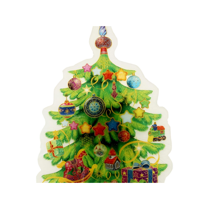 Яркое светодиодное освещение; Легкий монтаж на стекло без следов; Качественный ПВХ материал; Праздничный дизайн с елкой и игрушками; Компактный размер 12×8 см; Работает от батарейки CR2032