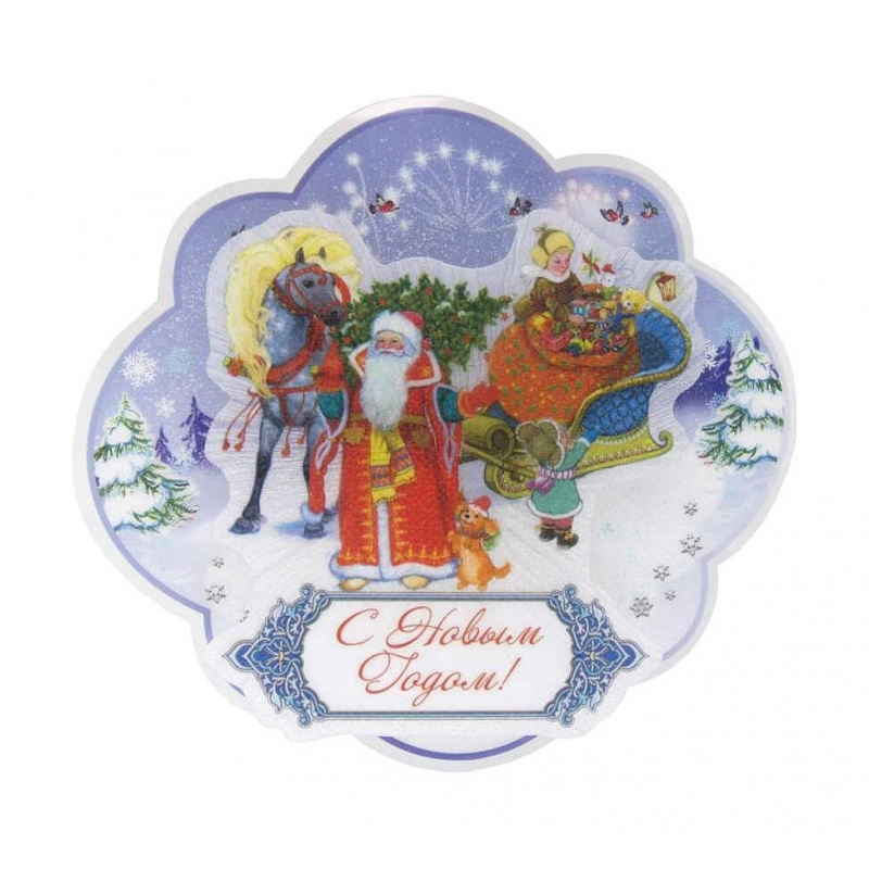 Яркий праздничный дизайн; Легкое нанесение на стеклянные поверхности; Качественный ПВХ материал; Компактный размер 13х12 см; Светодиодная подсветка для создания особой атмосферы