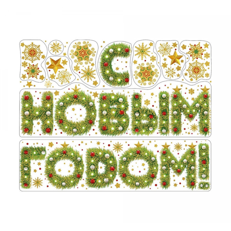Не оставляет следов после удаления; Легко наносится и снимается; Яркое новогоднее оформление; Подходит для любых гладких поверхностей; Качественный ПВХ материал