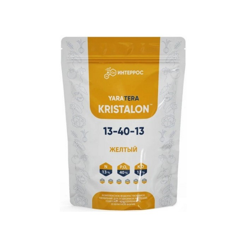 Комплексное водорастворимое удобрение (NPK 13-40-13+micro) для корневой и листовой подкормки всех сельскохозяйственных культур и любых технологий выращивания. Содержит весь набор макро- и микроэлементов. Удобрение повышает урожай, а также его качество. Повышает устойчивость растений к засухе и низким температурам, устойчивость к болезнями. Содержит микроэлементы в хелатной форме. Удобрение специально разработано для холодных и влажных почв. Используется для старта, чтобы стимулировать развитие корневой системы. Назначение: универсальное. Форма выпуска: водорастворимое. Вид удобрения: минеральное (неорганическое). Место применения: открытый грунт, комнатные растения, теплица/парник. Свойства: стимулирует рост, ускоряет корнеобразование, увеличивает урожайность, помогает справиться с перепадами температуры, улучшает структуру почвы, повышает иммунитет, устраняет дефицит питательных веществ. Норма внесения для подкормки: от 0. 2 до 0. 4 г/м²; от 0. 02 до 0. 06 л/м². Периодичность подкормки: при необходимости через 7-10 дней после первой обработки. Дозировка: 0. 2-1 кг на 100 л