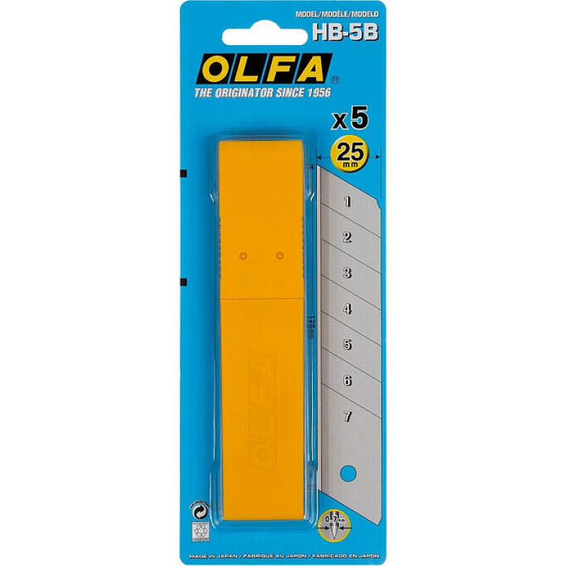 Лезвия сегментированные OLFA HB-5B изготовлены из высококачественной японской инструментальной стали. Профессиональная заточка обеспечивает исключительную остроту и длительный срок службы режущей кромки. Лезвия имеют гладкую сегментную линию для легкого и безопасного отламывания отработанных участков. Упакованы в прочный пластиковый кейс для удобного хранения и переноски. Ширина: 25 мм, длина: 126 мм, количество в упаковке: 5 шт.