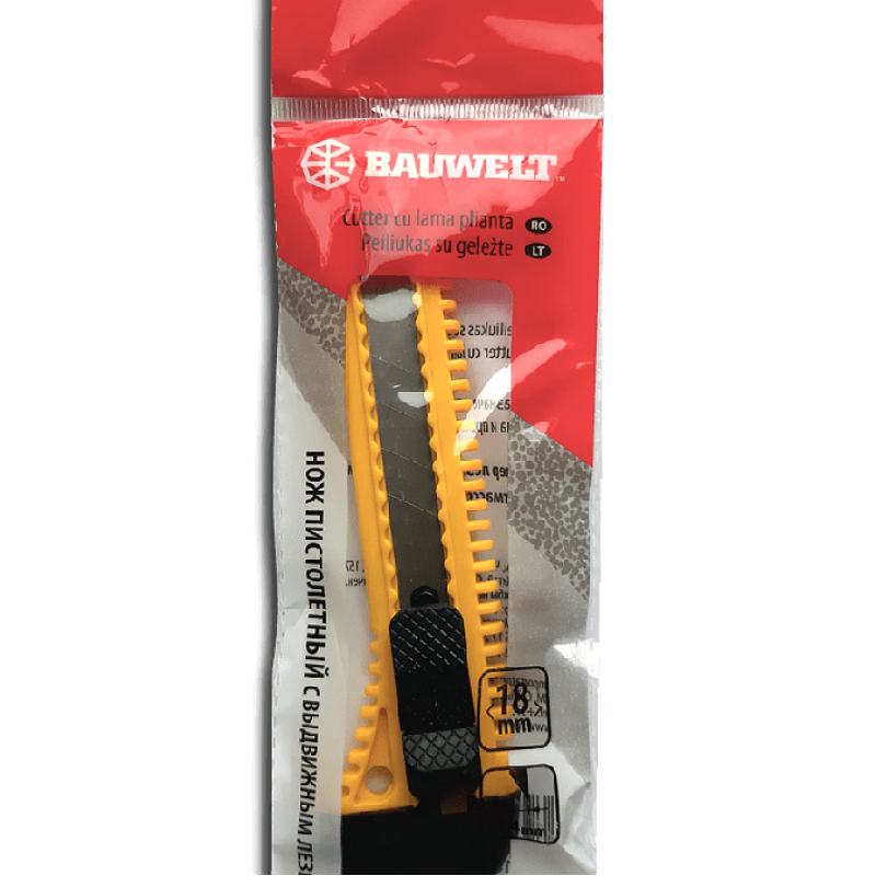 Профессиональный сегментированный нож Bauwelt с шириной лезвия 18 мм. Оснащен металлической направляющей для точности реза и надежным слайдерным фиксатором, который обеспечивает безопасность при работе и хранении. Эргономичная пластиковая рукоятка гарантирует комфортный хват. Идеальный инструмент для точных работ с различными материалами.