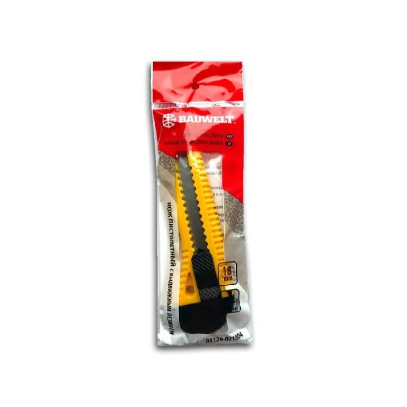 Профессиональный сегментированный нож Bauwelt с шириной лезвия 18 мм. Оснащен металлической направляющей для точности реза и слайдерным фиксатором для безопасной работы. Выдвижная конструкция с пластиковой рукоятью обеспечивает удобный хват и компактное хранение. Длина лезвия составляет 100 мм.