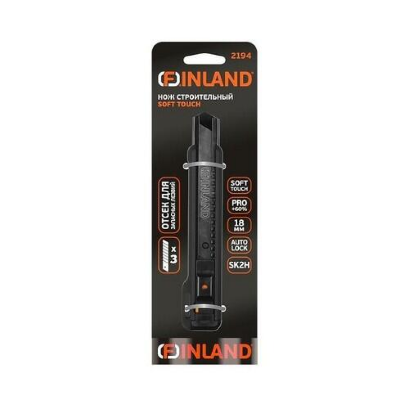 Профессиональный сегментированный нож Finland 2194 с шириной лезвия 18 мм. Конструкция с выдвижным сегментированным лезвием из стали SK2H и слайдерным фиксатором. Нож оснащен металлическими направляющими с защитным покрытием, автоматическим фиксатором перемещения лезвия, замком-кнопкой для безопасного хранения и встроенным отсеком для двух запасных лезвий. В комплекте поставляется 3 лезвия.