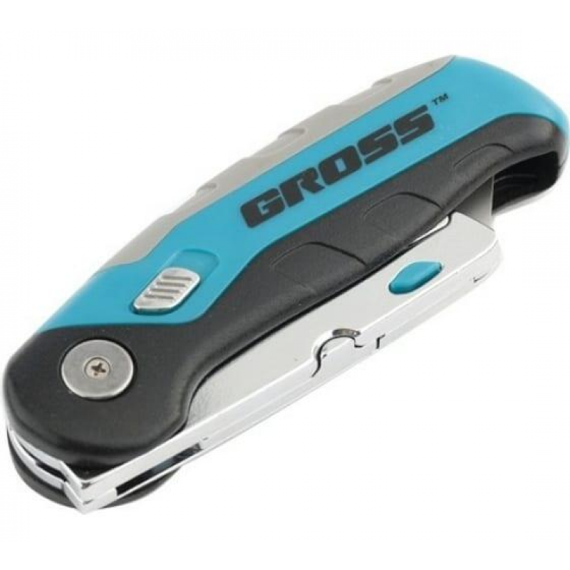 Складной профессиональный нож GROSS 78882 с трапециевидным лезвием. Общая длина 175 мм, ширина лезвия 19 мм, длина режущей части 60 мм. Комплектуется двумя запасными лезвиями и встроенным контейнером для их хранения. Эргономичная двухкомпонентная рукоятка обеспечивает надежный хват. Оснащен блокировкой от случайного складывания.