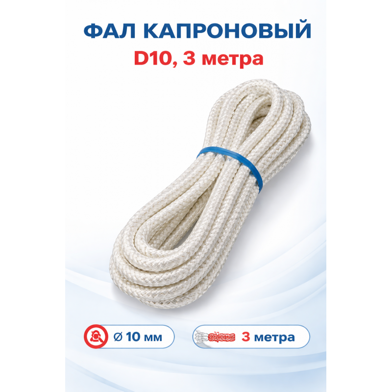 Капроновый фал диаметром 10 мм. Произведен в Беларуси из высококачественного синтетического материала. Продается метражом. Вес одного метра составляет всего 60 грамм.