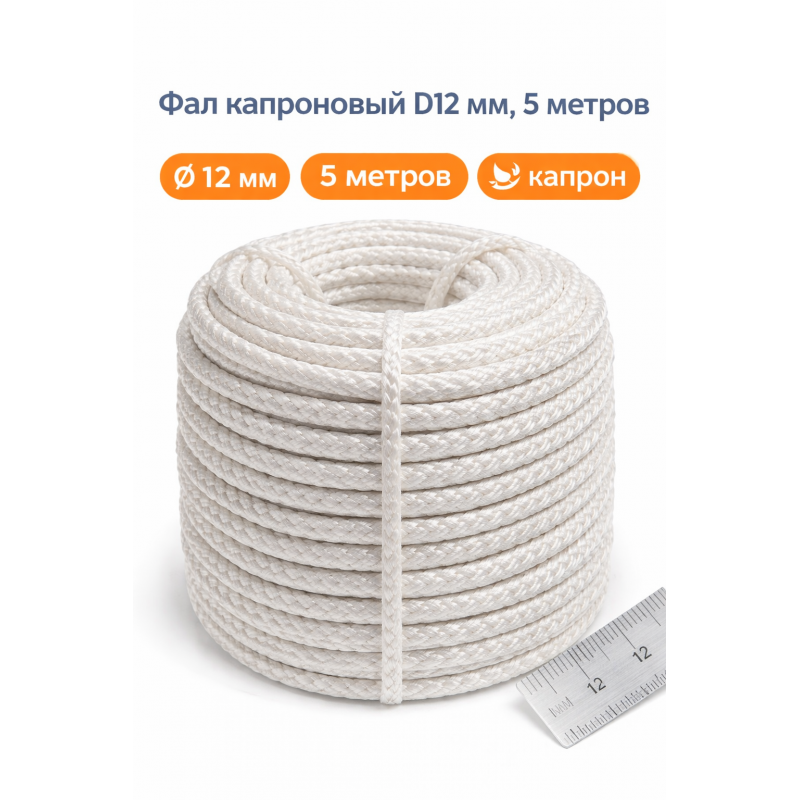 Капроновый фал диаметром 12 мм. Изготовлен из высококачественного синтетического материала, обладает высокой прочностью на разрыв и устойчивостью к внешним воздействиям. Продается метражом. Производство: Беларусь.
