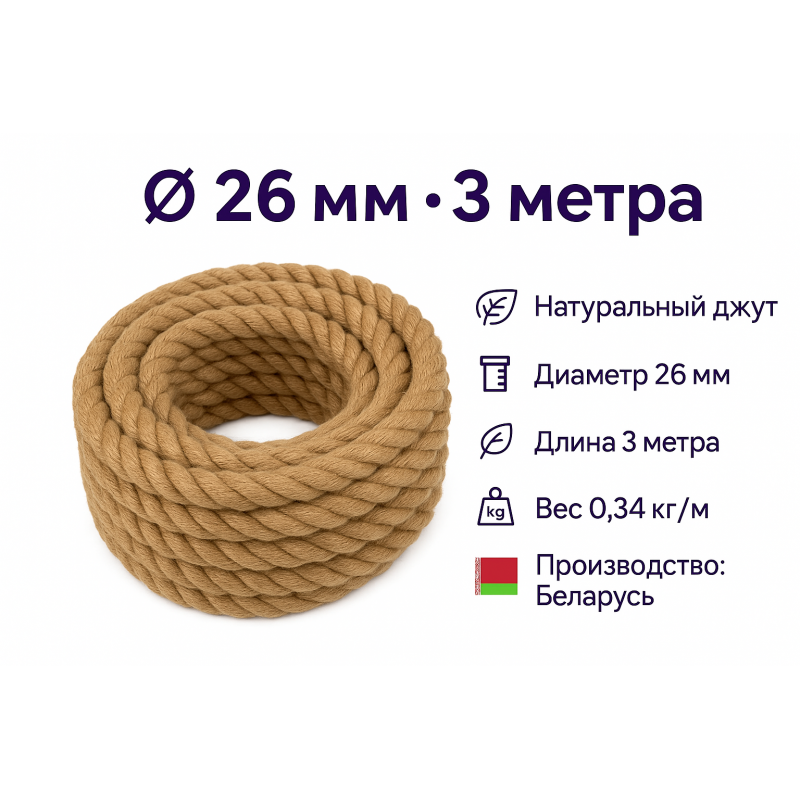 Джутовый канат D24 от бренда Канатбай. Натуральный канат диаметром 24 мм. Произведен в Беларуси. Продается погонными метрами. Вес одного метра: 0.27 кг.