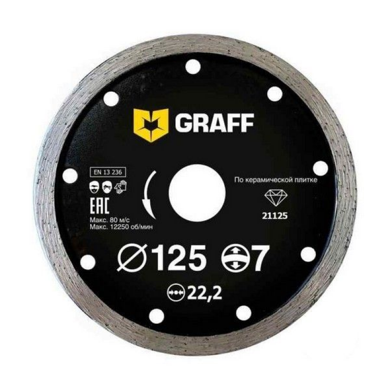 Диск алмазный GRAFF сплошной 125мм с увеличенной кромкой представляет собой высококачественный инструмент, разработанный для эффективной и точной резки керамических материалов. Его сплошная конструкция и увеличенная кромка обеспечивают отличную производительность и долговечность при эксплуатации, делая его идеальным выбором как для профессионалов, так и для домашних мастеров. Основные характеристики и преимущества: Диаметр диска: 125 мм обеспечивает широкий охват поверхности, значительно повышая скорость выполнения работ. Посадочный диаметр: 22.2 мм подходит для большинства стандартных инструментов, обеспечивая надежную фиксацию диска. Тип диска: Сплошной дизайн улучшает стабильность и точность резки. Высота алмазного слоя: 7 мм гарантирует высокую износостойкость и длительный срок службы диска даже при интенсивной эксплуатации. Толщина диска: 2 мм обеспечивает тонкую и точную резку, снижая вероятность перегрева и повышая качество обработки. Тип реза: Возможность мокрого и сухого реза делает диск универсальным инструментом для различных условий работы. Обрабатываемые материалы: Идеально подходит для резки керамики, что делает его незаменимым на строительных площадках и в ремонте. Вес: 0.1 кг обеспечивает баланс между прочностью и удобством использования, снижая нагрузку на оборудование при длительной работе. Производитель: Graff, известная своим качеством и надежностью. Бренд: Graff, признанный лидер на рынке алмазных инструментов. Страна производства: Китай, что гарантирует доступную цену без потери качества. Высокая износостойкость диска достигается благодаря толстой алмазной кромке, что обеспечивает длительный срок службы и снижает затраты на замену инструмента. Сплошная конструкция диска повышает стабильность и точность резки, позволяя выполнять работу быстро и аккуратно. Универсальность использования как для мокрого, так и для сухого реза расширяет возможности применения диска в различных условиях работы. Применение: Диск алмазный GRAFF сплошной 125мм с увеличенной кромкой идеально подходит для: Резки керамической плитки и керамогранита Обработки бетонных плит и конструкций Выполнения точных и чистых резов в сложных условиях Подготовки поверхностей для укладки новых материалов Установка и эксплуатация: Для установки диска на инструмент необходимо обеспечить соответствие посадочного диаметра 22.2 мм. Рекомендуется использовать диск совместно с оборудованием для мокрого или сухого реза в зависимости от требований проекта. Перед началом работы убедитесь в правильной установке диска и соблюдайте рекомендации производителя по эксплуатации. Правильная техника резки поможет предотвратить перегрев инструмента и продлить срок службы диска. Безопасность и советы по использованию: Правильная установка: Убедитесь в корректной фиксации диска на инструменте, чтобы избежать вибраций и повреждений. Мокрый и сухой рез: Выбирайте соответствующий тип реза в зависимости от обрабатываемого материала и условий работы для оптимальной производительности. Защитное оборудование: Всегда носите защитные очки, перчатки и другую защитную экипировку для обеспечения безопасности во время работы. Регулярная проверка: Периодически осматривайте диск на наличие признаков износа или повреждений и своевременно заменяйте его пр