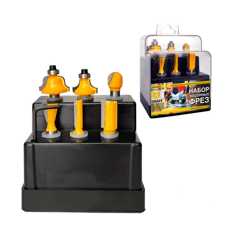 Этот компактный набор включает 6 фрез, специально разработанных для выполнения различных задач по дереву с высокой точностью и стабильностью. Полезные характеристикиРазнообразие возможностей: Фрезы позволяют выполнять широкий спектр задач — от создания пазов до обработки кромок, обеспечивая гибкость в работе над проектами разной сложности.Универсальные размеры: Фрезы с диаметрами от 6 до 25,4 мм подходят для обработки как мелких, так и крупных деталей, предоставляя свободу выбора.Прочные материалы: Высококачественные износостойкие материалы обеспечивают долгий срок службы фрез, устойчивость к нагрузкам и стабильное качество обработки.Универсальный хвостовик: Хвостовик диаметром 8 мм подходит для большинства фрезерных станков, обеспечивая надежную фиксацию и безопасность.Компактный вес: Общий вес 0,25 кг позволяет легко транспортировать и удобно использовать фрезы, что особенно ценно при частом перемещении инструмента.ПреимуществаМногофункциональность: Набор подходит как для кромочных, так и для пазовых работ, что делает его отличным выбором для различных задач.Экономия средств: Комплект из 6 фрез предоставляет необходимые инструменты по более выгодной цене, чем покупка по отдельности.Долговечность: Прочные материалы и качественная обработка гарантируют стабильную работу и долгий срок службы.Удобство использования: Легкий вес и универсальный хвостовик упрощают установку и использование фрез, экономя ваше время и усилия.Основные области примененияДеревообработка: Идеально подходит для создания пазов, профилей и аккуратных кромок в изделиях из дерева.Ремонт: Ускоряет выполнение задач, требующих точных и чистых резов.Хобби и DIY: Оптимальный выбор для любителей ручной работы и создания уникальных проектов.Профессиональное использование: Подходит для мастерских и производственных задач, требующих надёжного и качественного инструмента.Дополнительная информацияПроизводитель: GraffСтрана производства: КитайДиаметр фрезы: от 6 до 25,4 ммДиаметр хвостовика: 8 ммВес: 0,25 кг