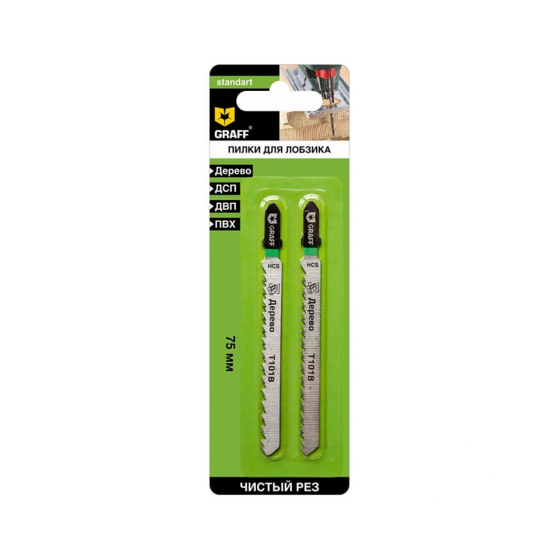 Пилка T101B HCS Standart GRAFF 131175 подходит для прямого реза мягкой древесины, ДВП, ДСП, столярных и волокнистых плит с толщиной 3 – 30 мм, для ПВХ труб диаметром до 30 мм.