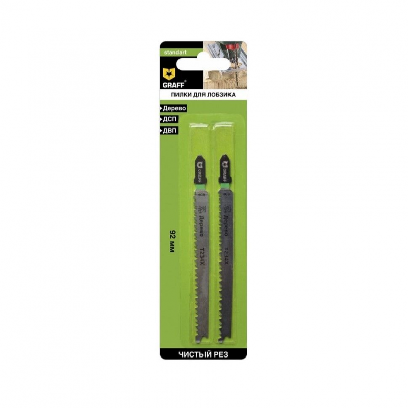 Пилка T234X HCS Standart GRAFF 131392 подходит для прямого реза мягкой древесины, ДВП, ДСП, столярных и волокнистых плит толщиной 3 – 65 мм.