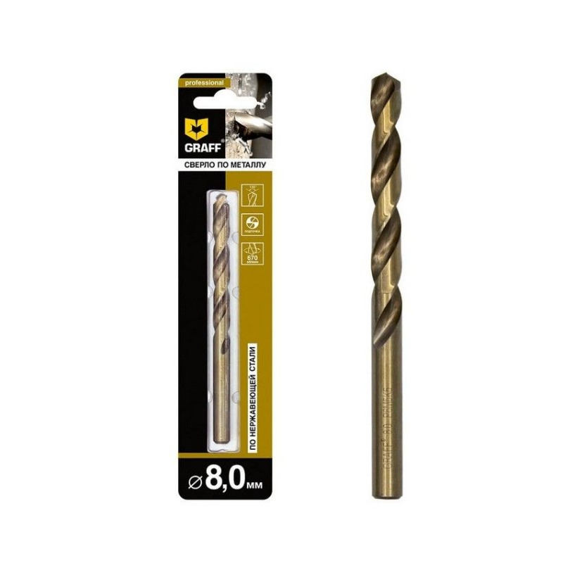 Профессиональное сверло по нержавеющей стали 8,0 мм GRAFF из быстрорежущей стали Р6М5К5. Данные сверла имеют более высокий класс точности А1 благодаря вышлифованной кромке.
