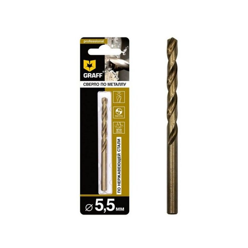 Профессиональное сверло по нержавеющей стали 5,5 мм GRAFF из быстрорежущей стали Р6М5К5. Данные сверла имеют более высокий класс точности А1 благодаря вышлифованной кромке.