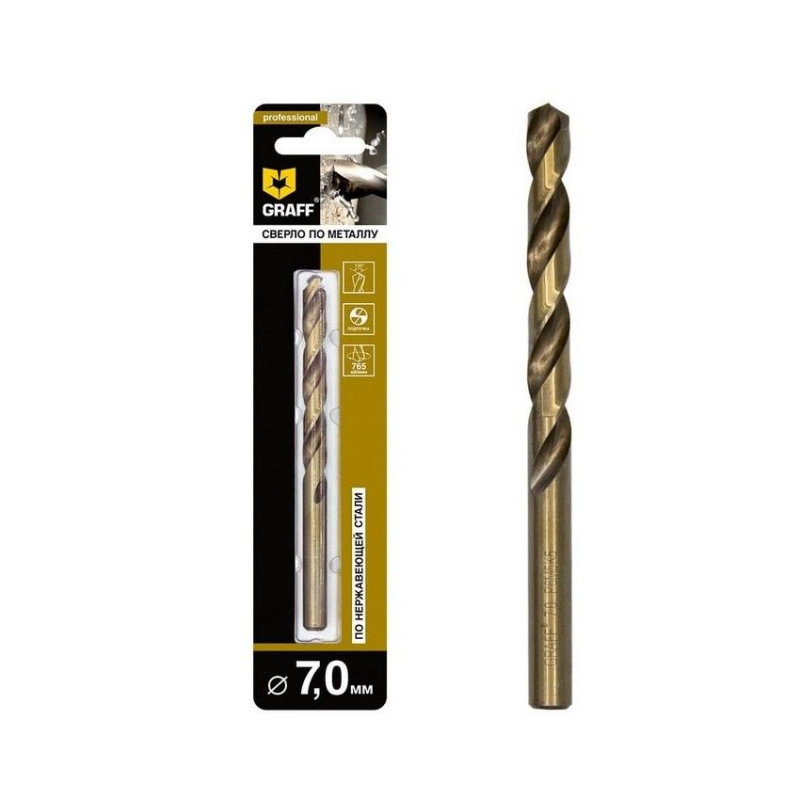 Профессиональное сверло по нержавеющей стали 7,0 мм GRAFF из быстрорежущей стали Р6М5К5. Данные сверла имеют более высокий класс точности А1 благодаря вышлифованной кромке.