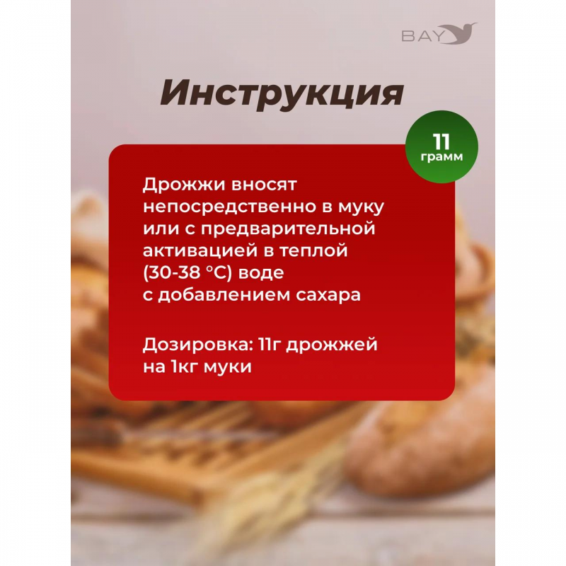 Способ применения: дрожжи вносят непосредственно в муку или с предварительной активацией в теплой (30-38°С) воде с добавлением сахара.